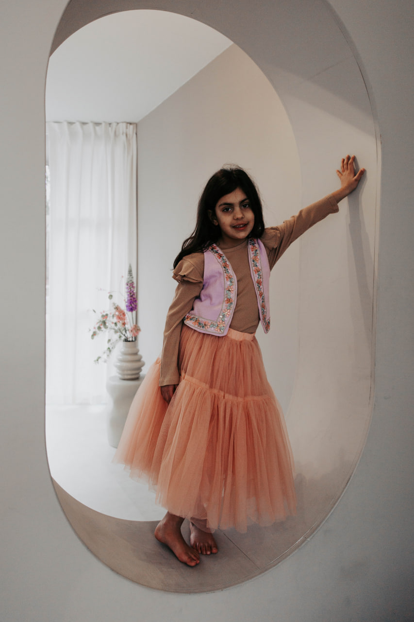 Ons model heeft maat 122/128 en draagt maat 134/140 valt klein.
